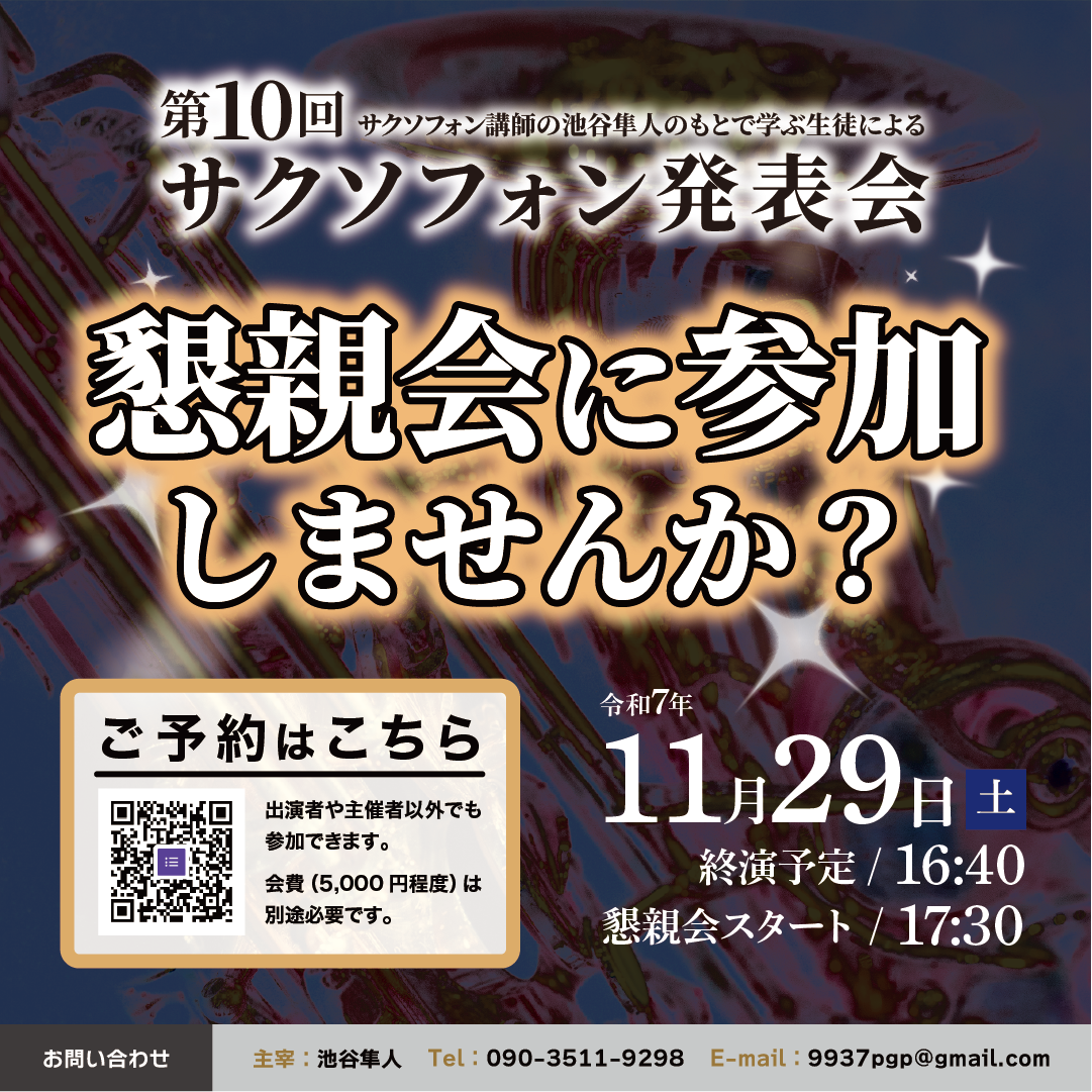 ※池谷隼人との共演(サクソフォンまたはピアノ)も可能です(無料)。申し込みのときに演奏者として記入してください。
